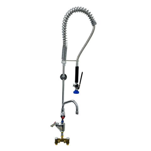 Single Deck Spring Prerinse Unit with Ceramic Cartridges, Lever Handles, Addon Faucet, 16" Swing Spout, Temperature Adjusting Valve